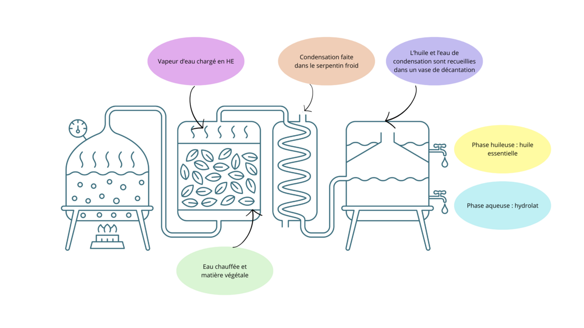 Les huiles essentielles sont extraites de plantes par un processus appelé “distillation à la vapeur”. Les plantes sont placées dans un alambic. C’est un système qui permet de chauffer de l'eau qui se transforme en vapeur et qui vient traverser les matières végétales. Les vapeurs entraînent ensuite les composés aromatiques des plantes à travers un serpentin, où elles sont refroidies, puis condensées en une phase liquide qui est collectée dans un récipient. Ce liquide comprend lui-même deux phases qui seront ensuite séparées :